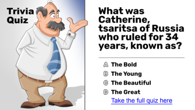 In this fun trivia quiz we're going to ask questions like "What was Catherine, tsaritsa of Russia who ruled for 34 years, known as?" and "Which teenage girl gained fame in France during the Hundred Years' War?".