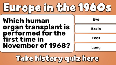 In this fun trivia quiz we're going to ask questions like "Which human organ transplant is performed for the first time in November of 1968?" and "In June of 1963, John F. Kennedy visits what major Italian city?".